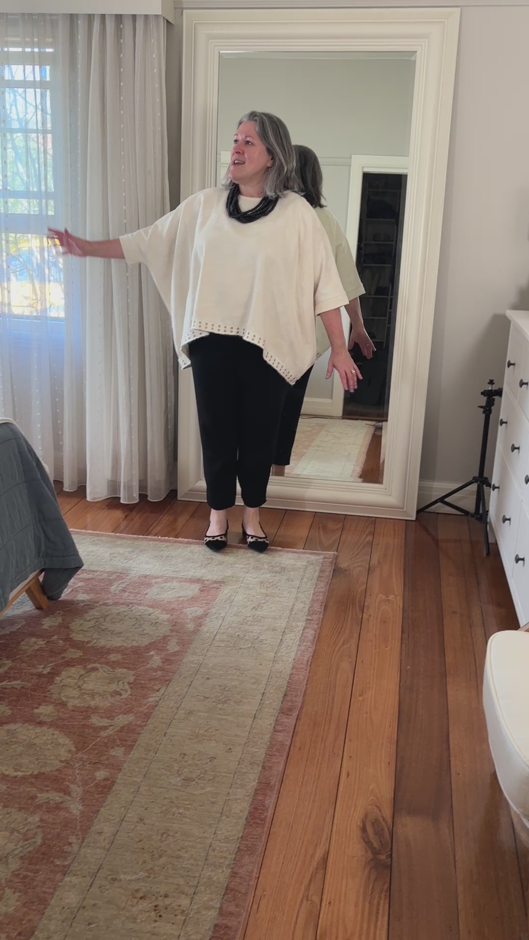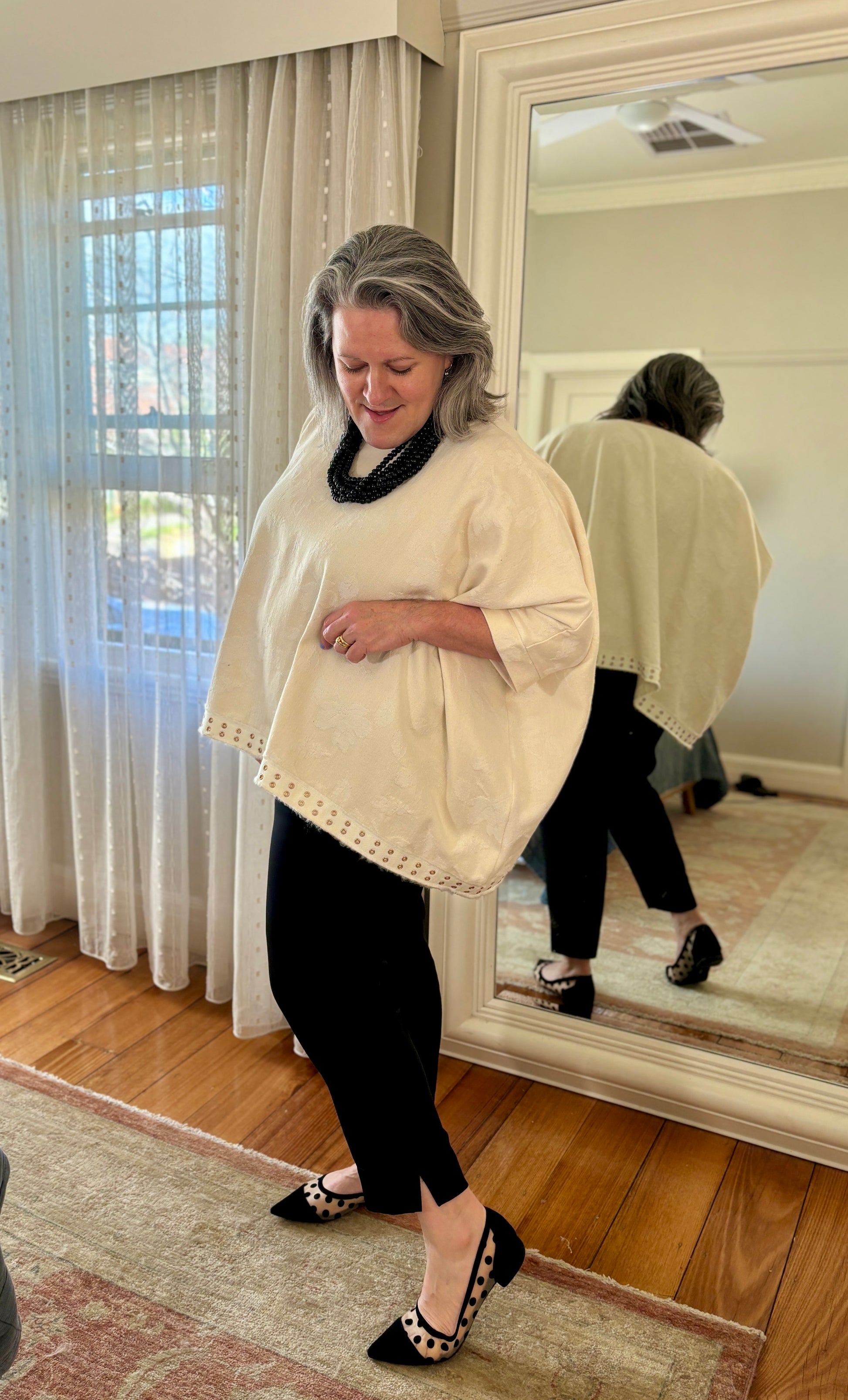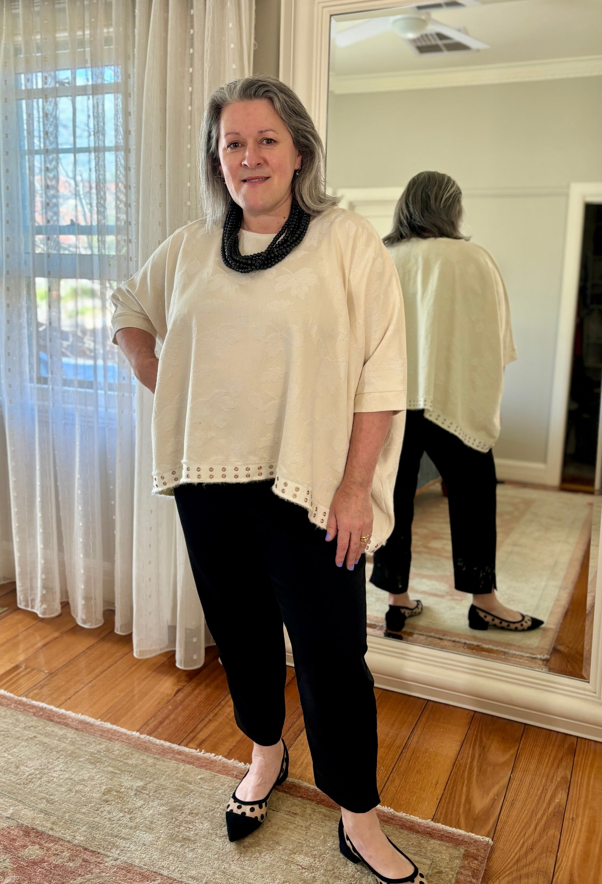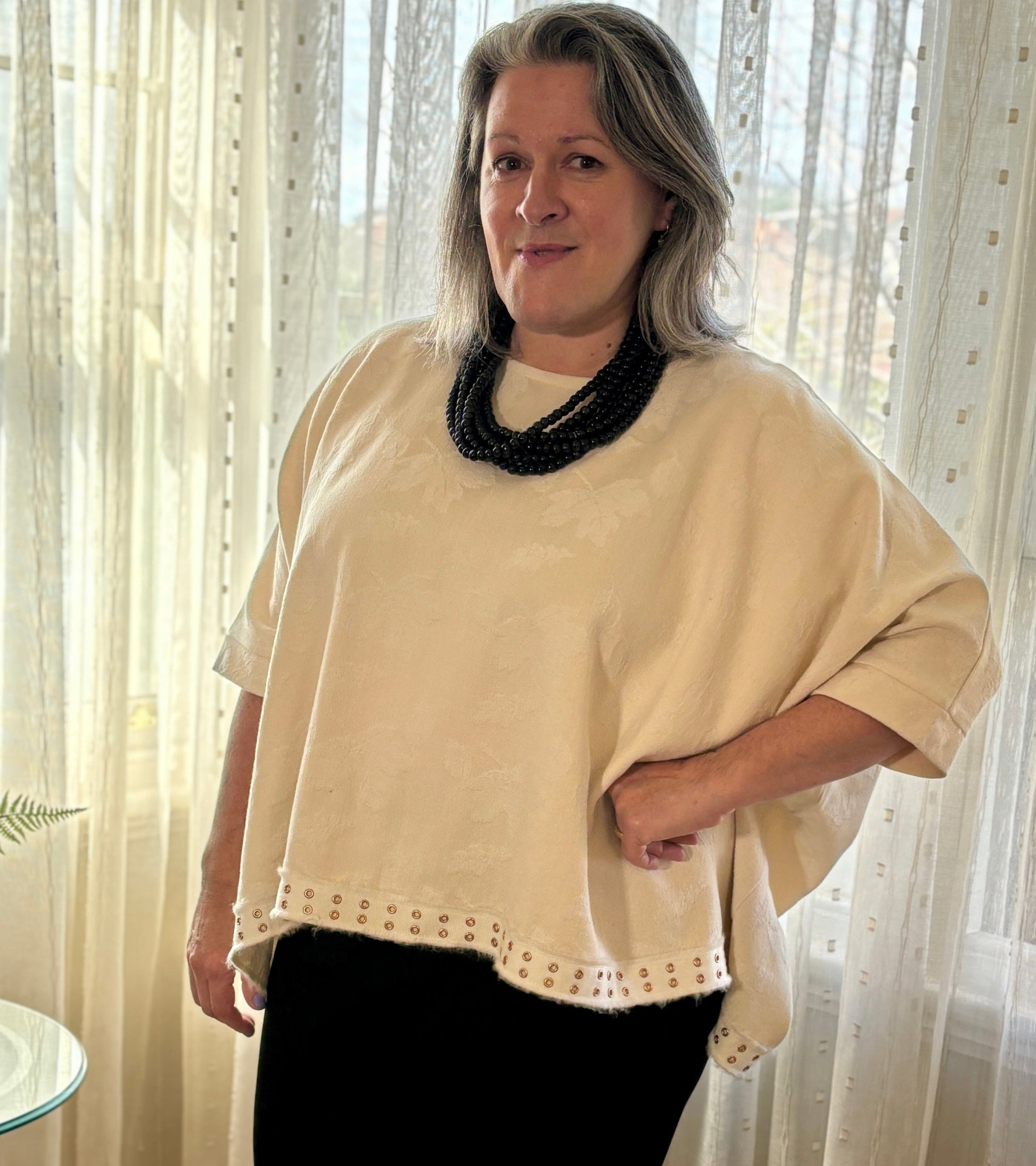 Alexa is a stunningly stylish top, using this delicious repurposed 100% cotton damask in Winter White with a grosgrain ribbon trim. With its relaxed fit and high-quality drape, it is the perfect addition to any wardrobe. The top features dolman sleeves and is finished with a sleek band at the three-quarter arm length. Use it as a layering piece or over slimline trousers or skirts. Only one available in this unique colorway.