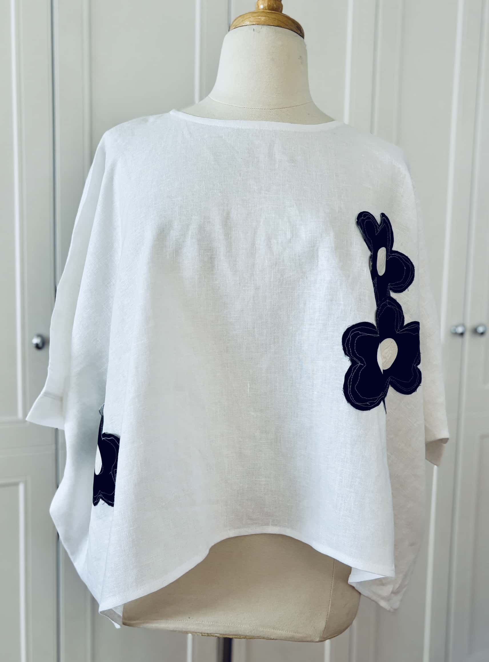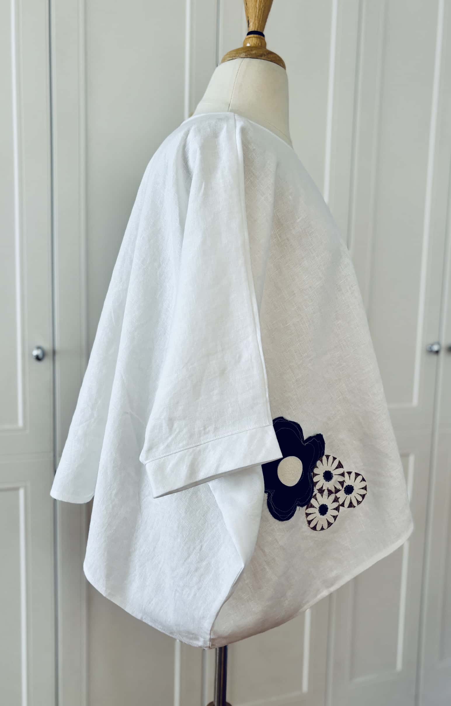 One-of-a-kind – only one available in this exclusive colorway. 100% winter white linen with black and brown flowers free motion stitching embellishment.