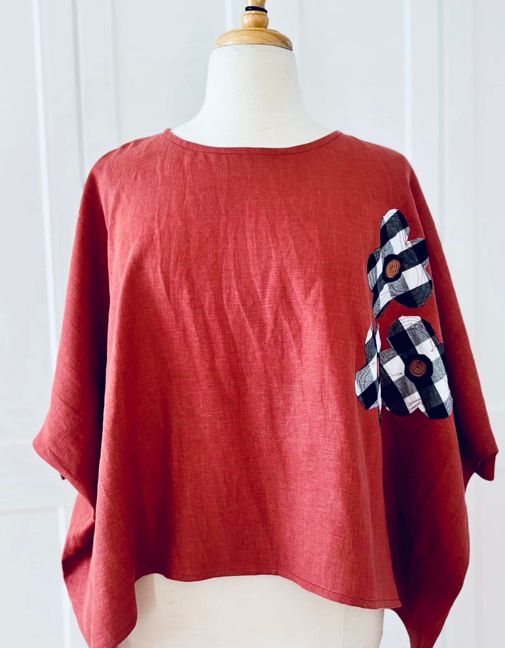 One-of-a-kind – only one available in this exclusive colorway. 100% rust linen with black and white gingham flowers free motion stitching embellishment.