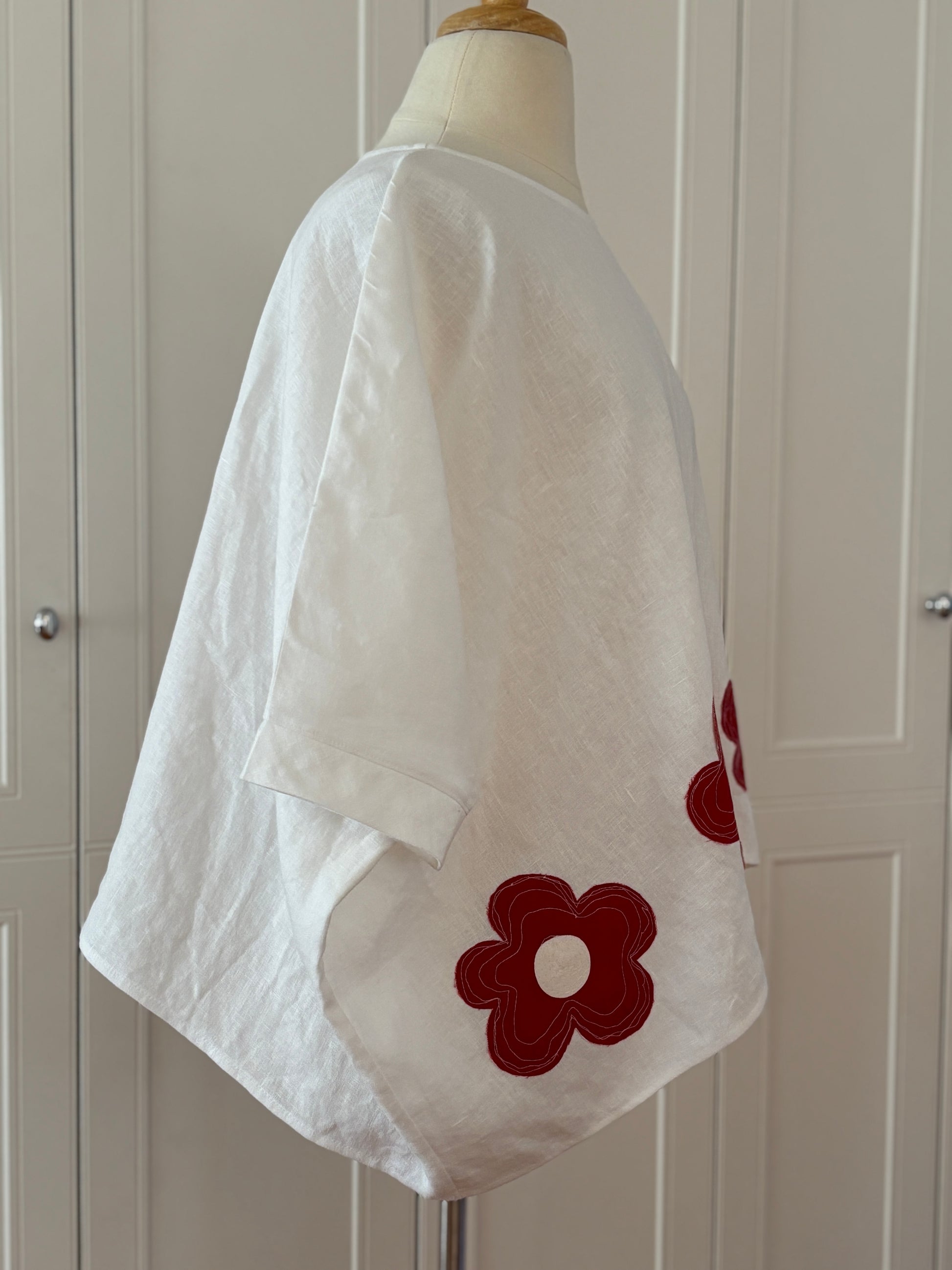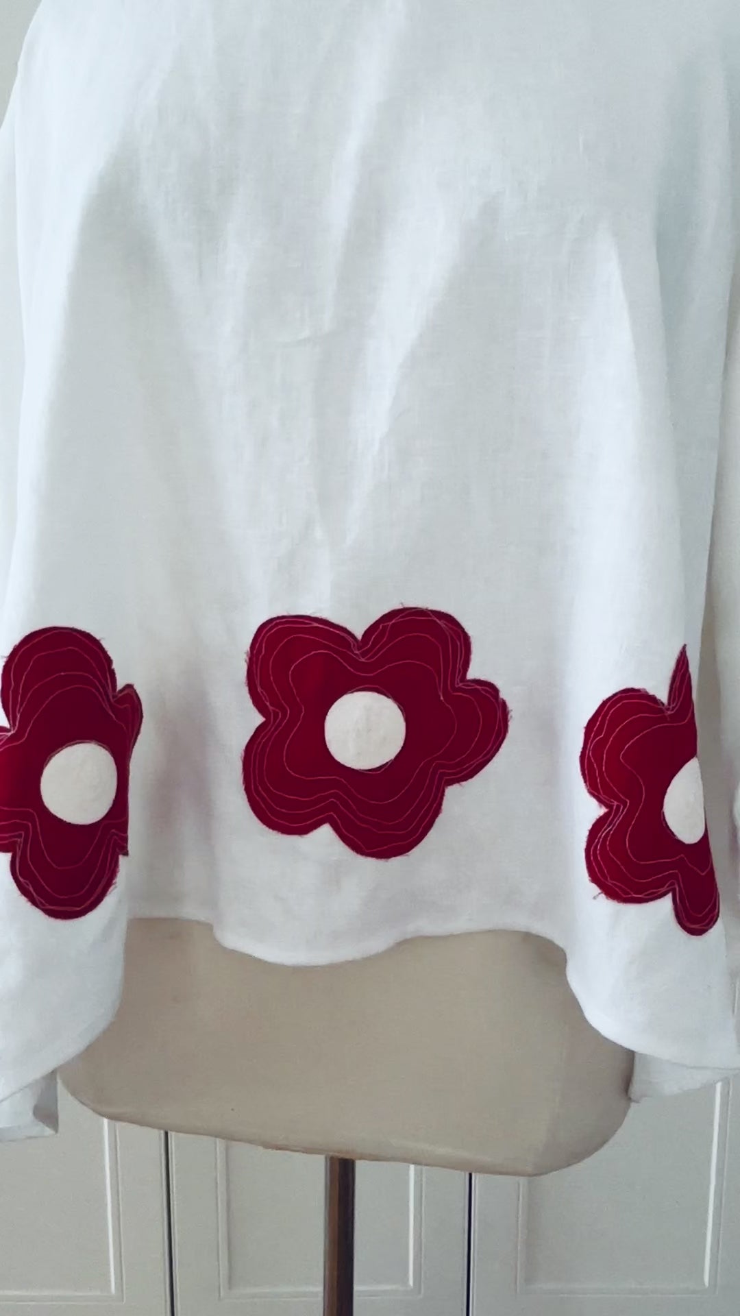 One-of-a-kind – only one available in this exclusive colorway. 100% winter white linen with free motion stitched red flowers.