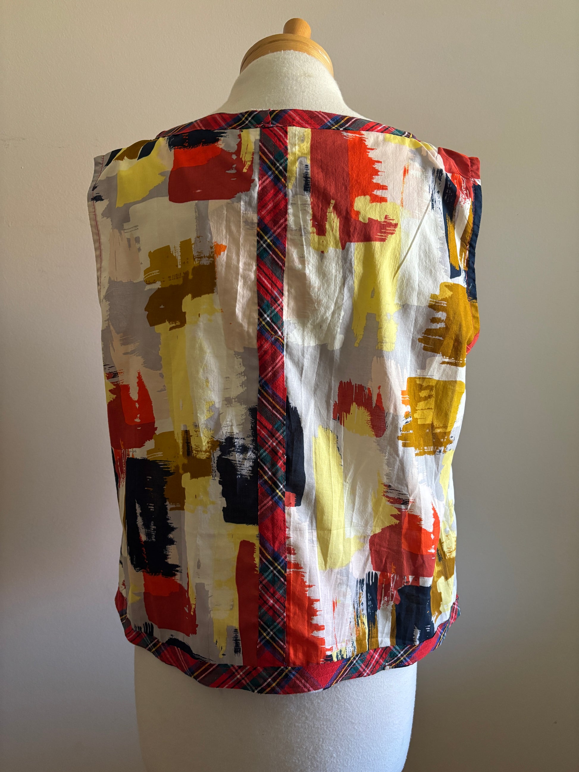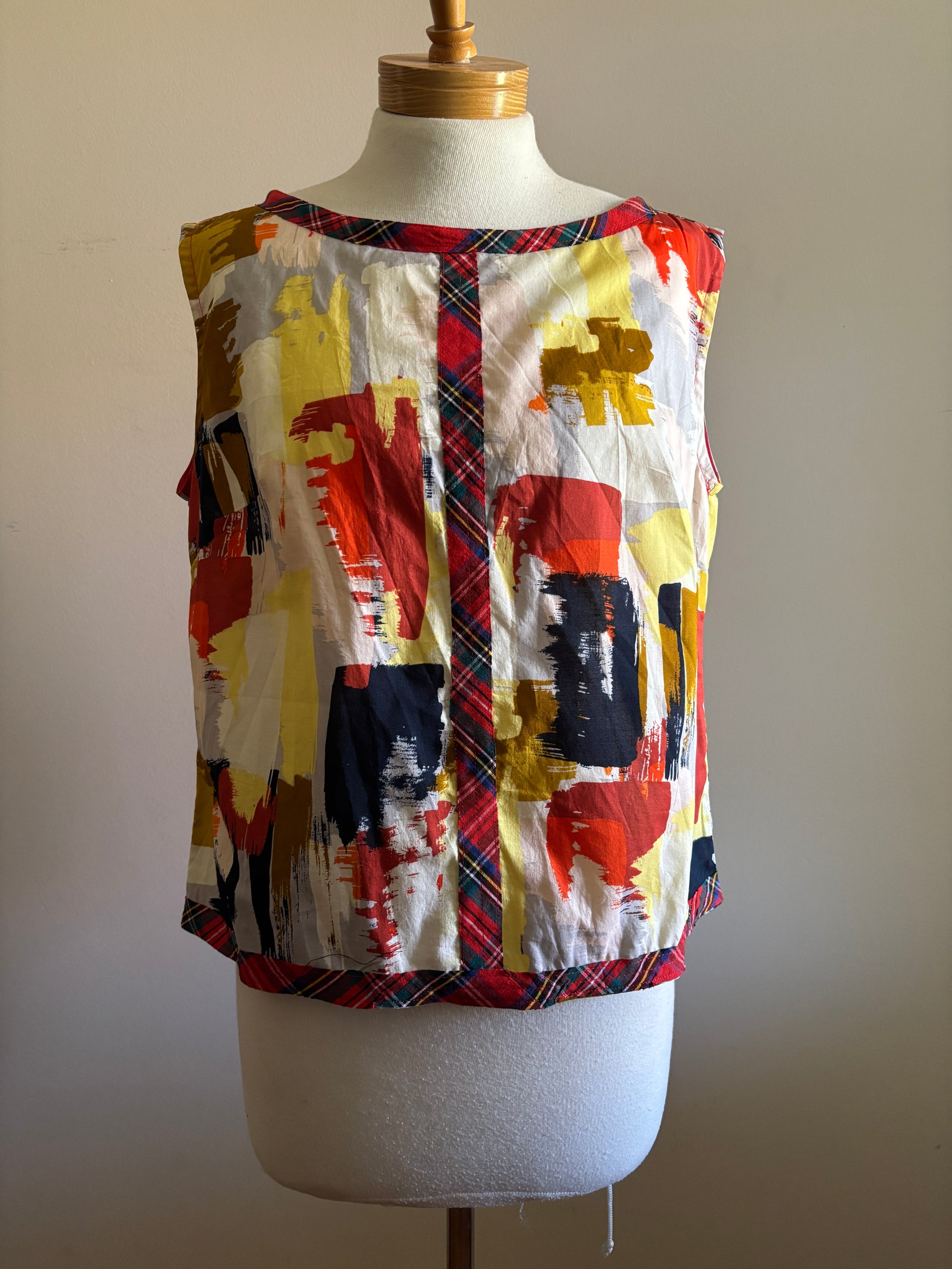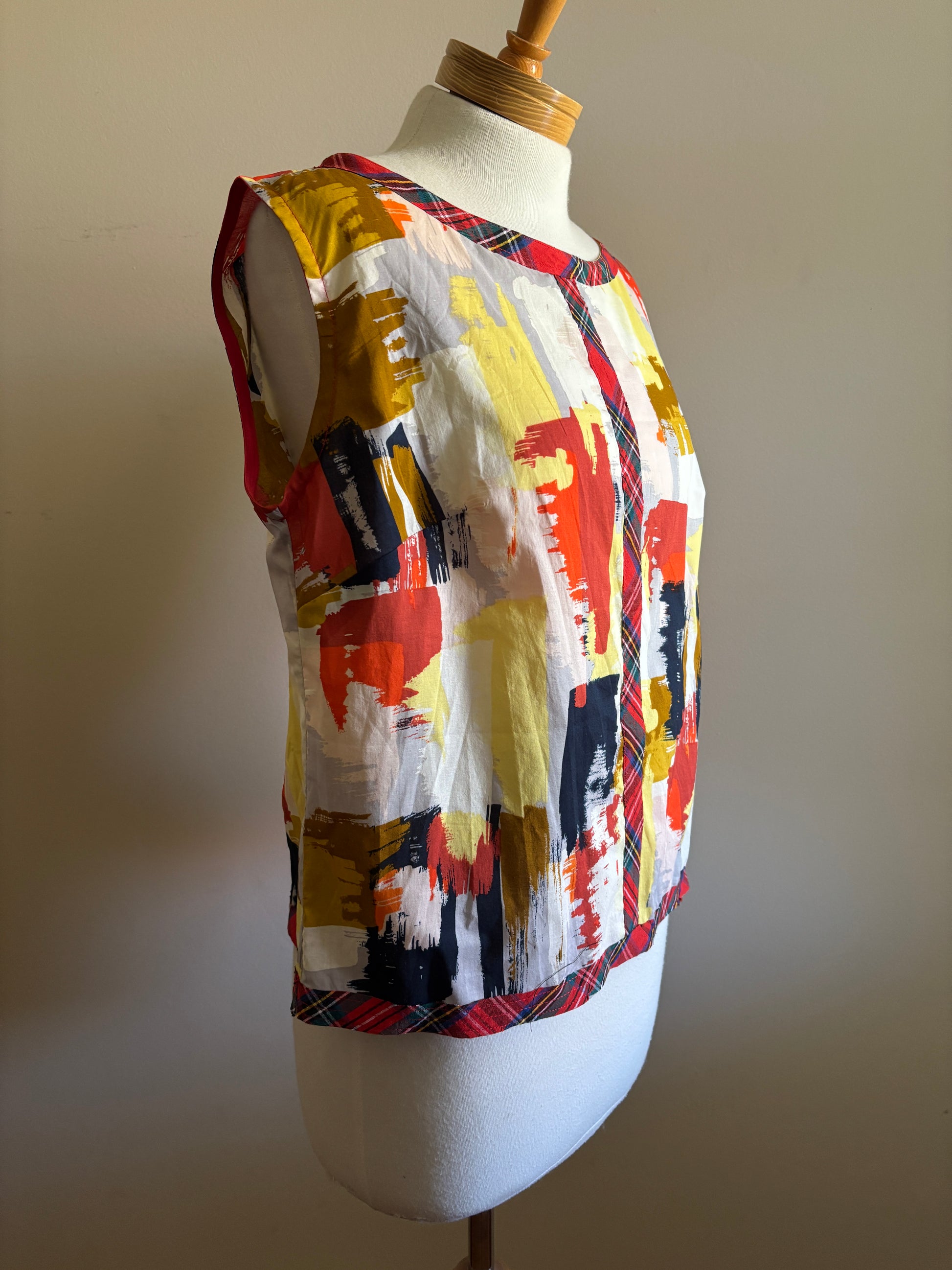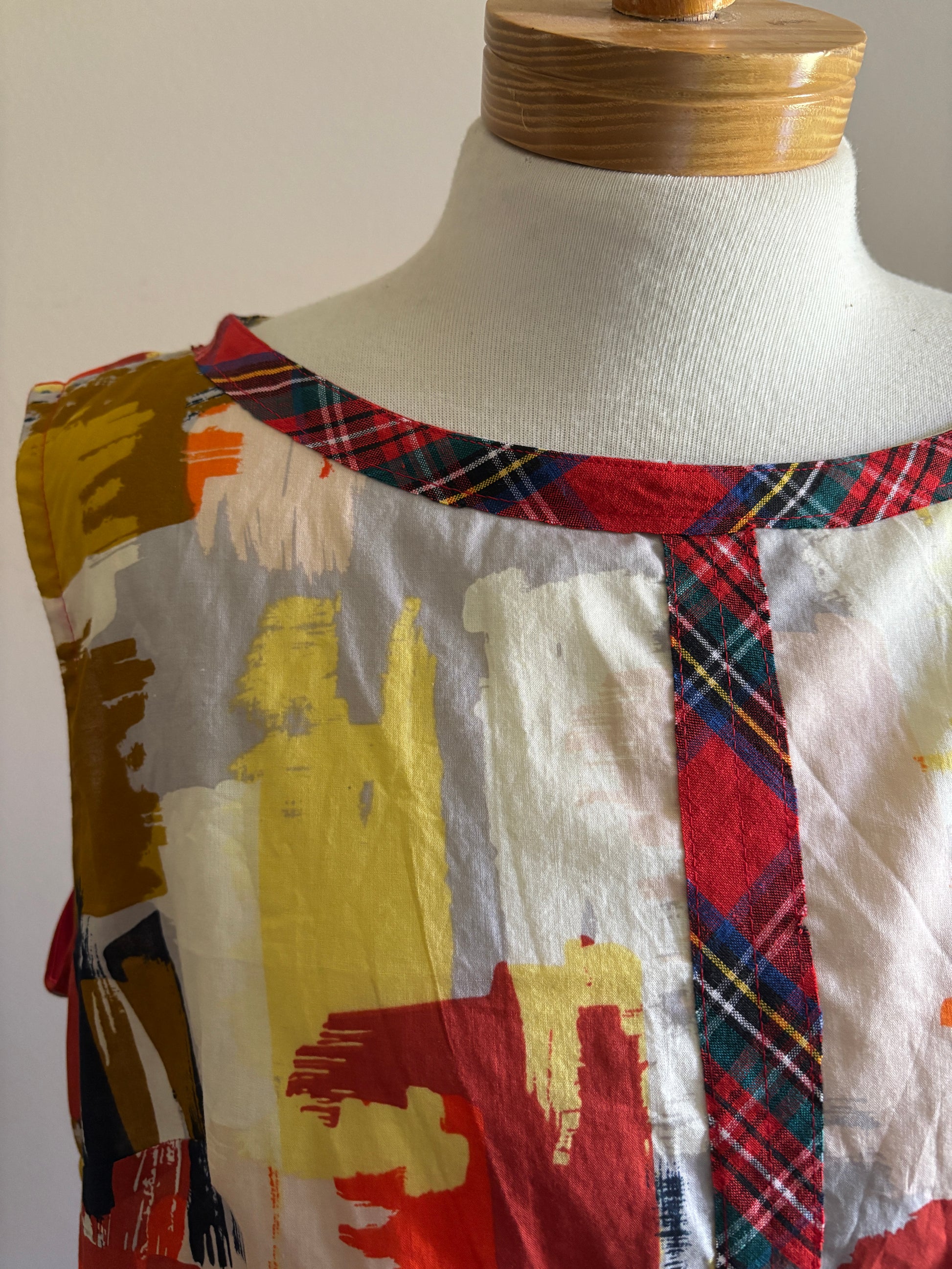 This one-of-a-kind medium sized pop-over top is made from the softest and coolest vintage cotton voile, and adorned with a unique red tartan linen detail. It is also sleeveless, making it the perfect addition to your summer wardrobe.