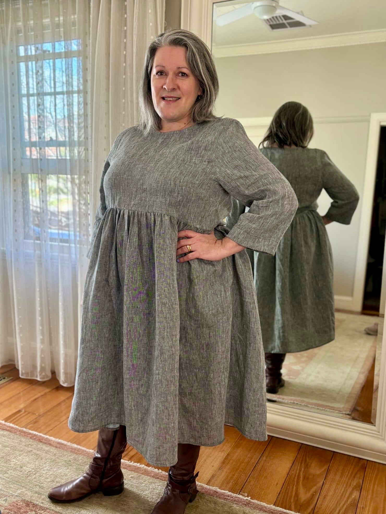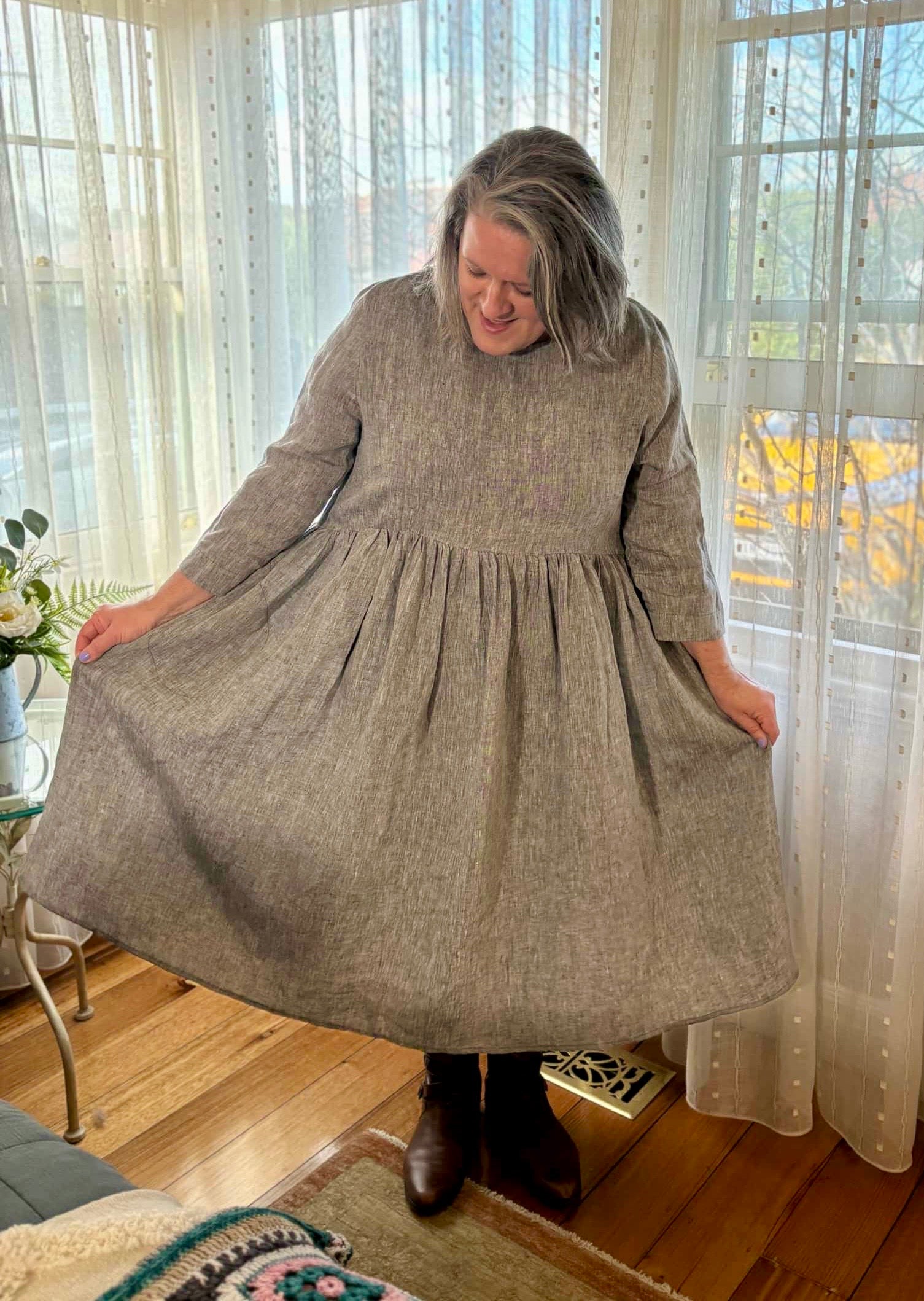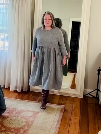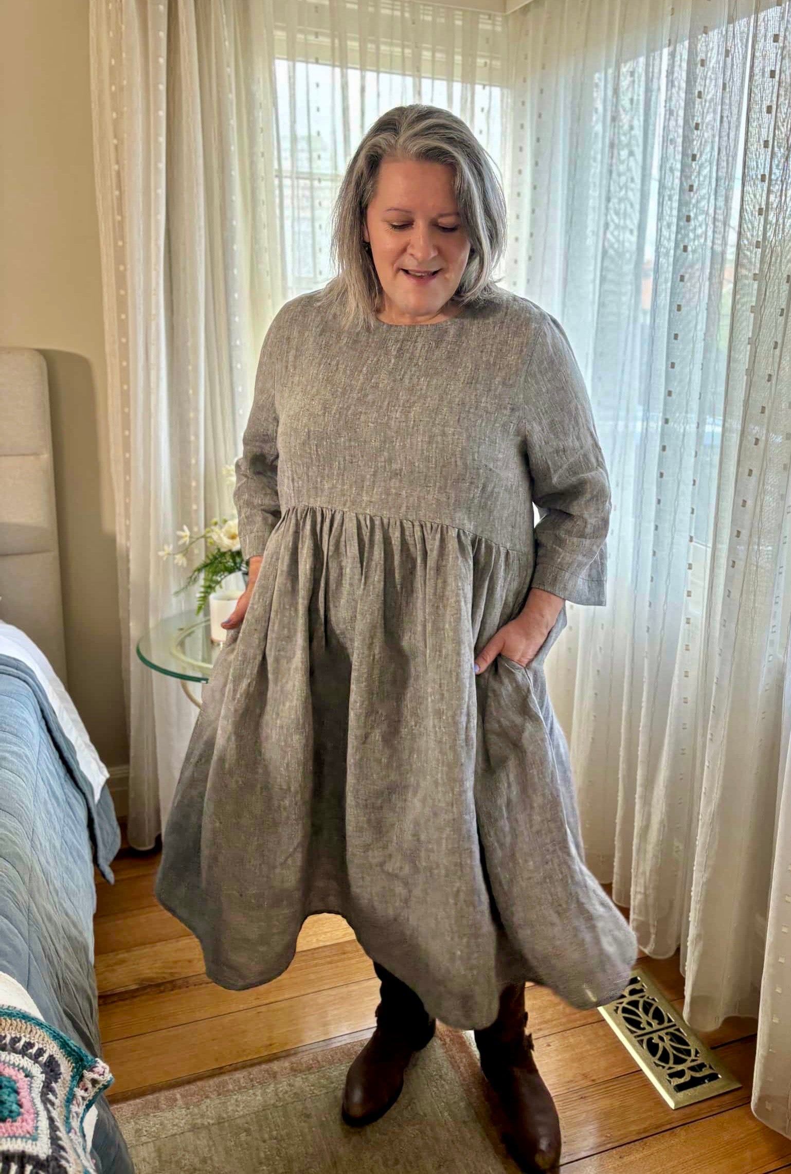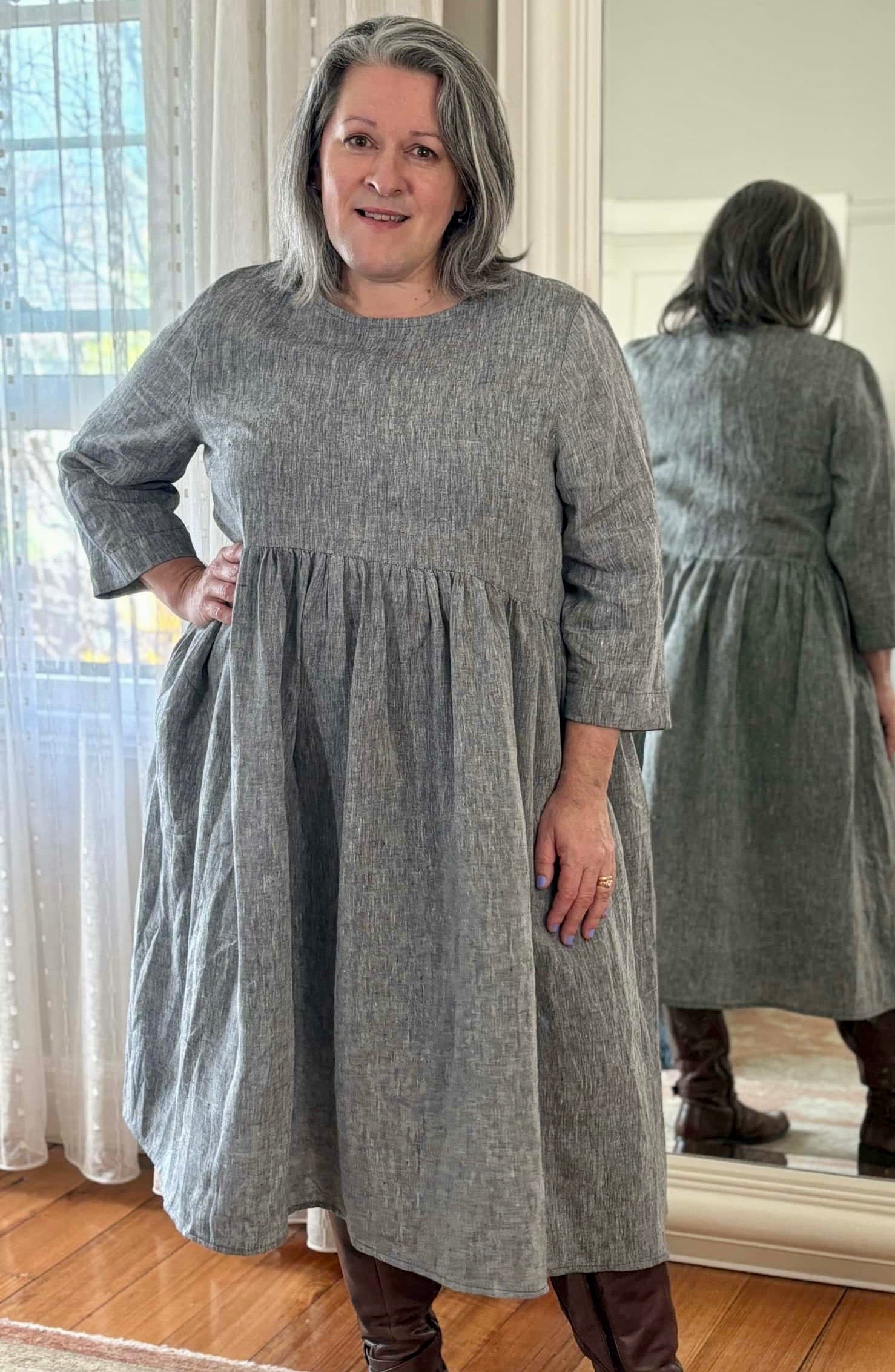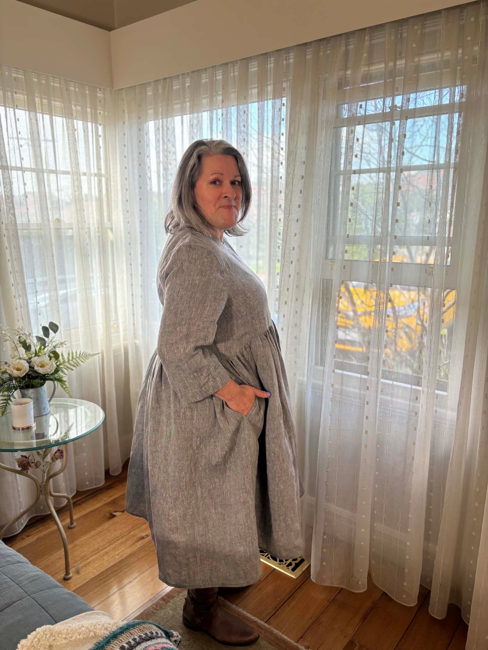 She has to be the most comfortable and stylish dress ever! She has bust darts, set in sleeves, and a slight tuxedo hemline. She still has the pockets (of course!) and is superbly comfortable to wear.